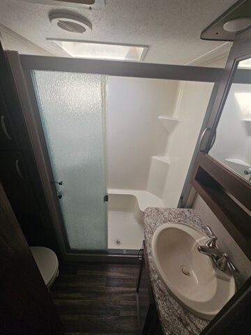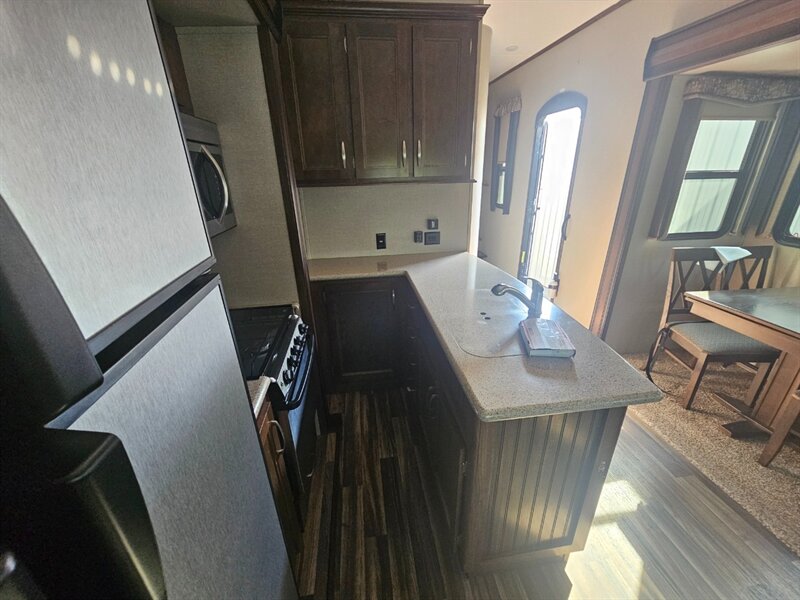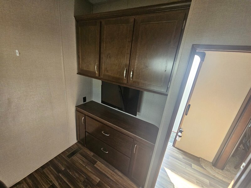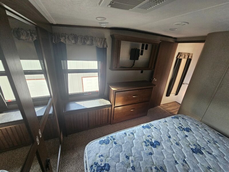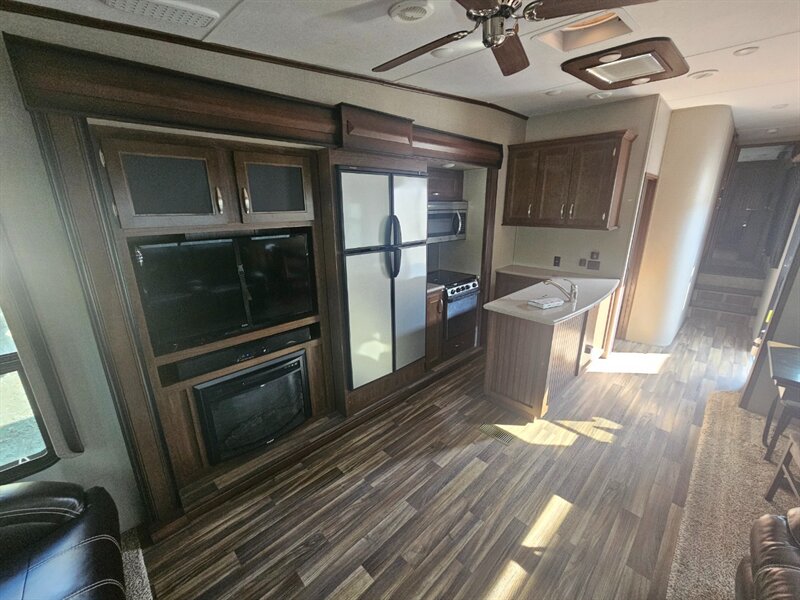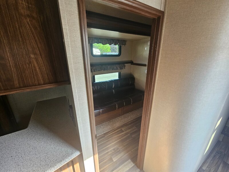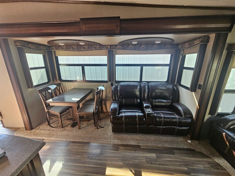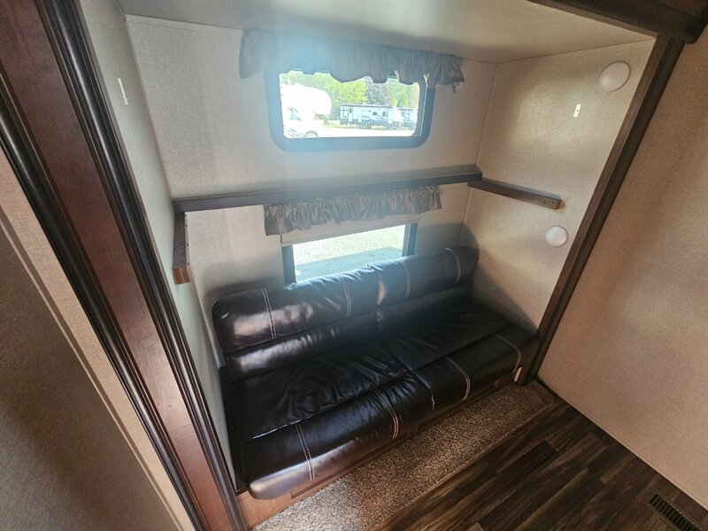 This 2017 Keystone Montana High Country 370BR is a rear living, bunkhouse (in the slide) floor plan. The versatile bonus room can function as a guest space or office. Key features include a double-entry step with a low first step, a large pass-through storage area, and an auto-level system. The interior features theater seating, a freestanding dinette, and a full-size kitchen with a French-door refrigerator. The bunkhouse - bonus room includes a bunk that folds up or down and a fold-out sofa, providing flexible sleeping and living options. Come take a look at this camper, it won't last long at this price.