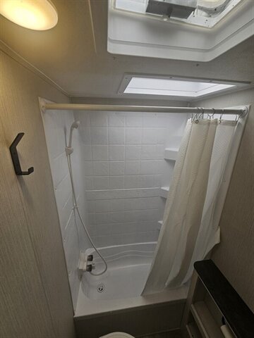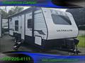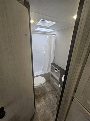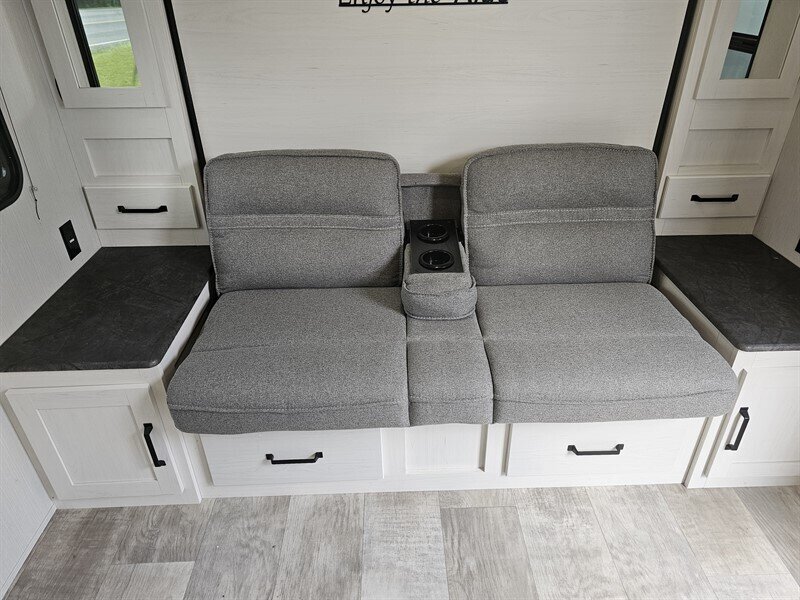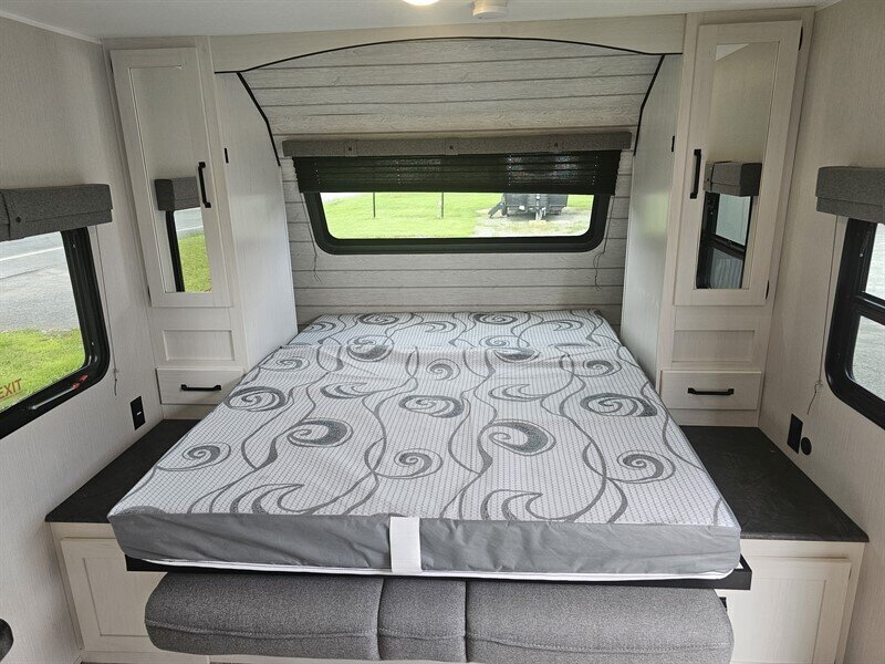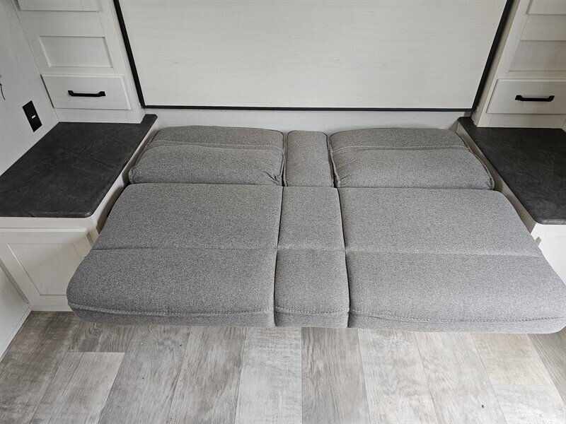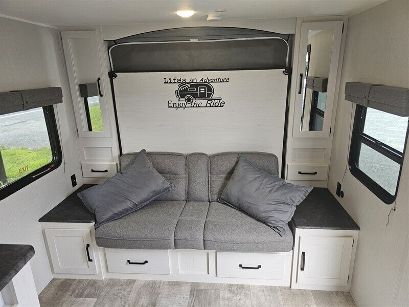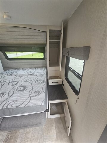This travel trailer does not have any slide outs which makes this camper super light weight and easy to pull wherever you decide to go. With a murphy bed in the front of the camper, you are granted a comfortable sleeping area that can easily convert into a big entertainment area. Toward the back of the camper you will have double stacked beds and a bathroom for your guests to enjoy a comfortable stay. The booth dinette can be setup as additional sleeping as well. This unit comes with an outside kitchen that includes a large cast iron griddle, hot and cold running water with sink, and a mini-fridge.