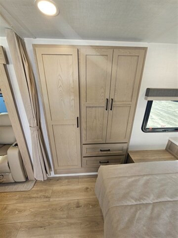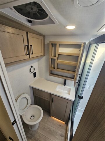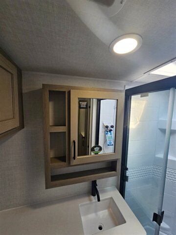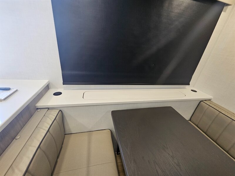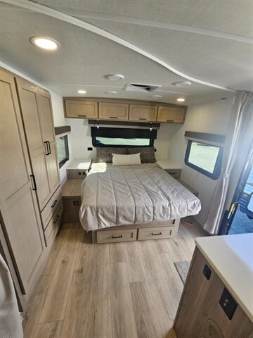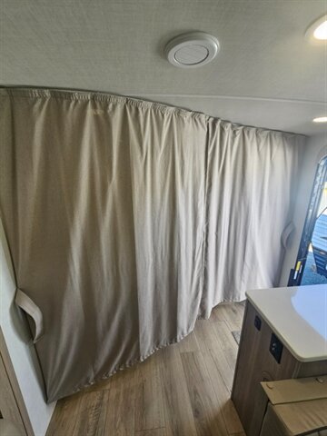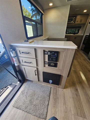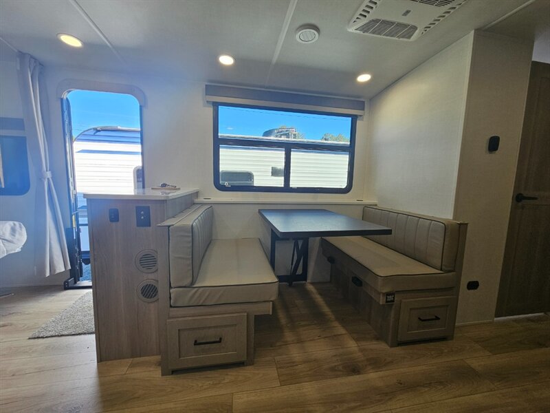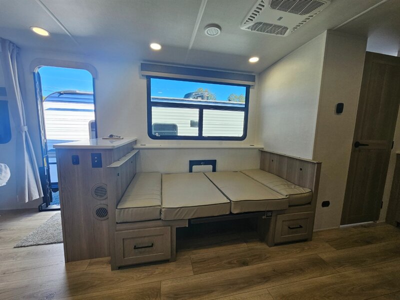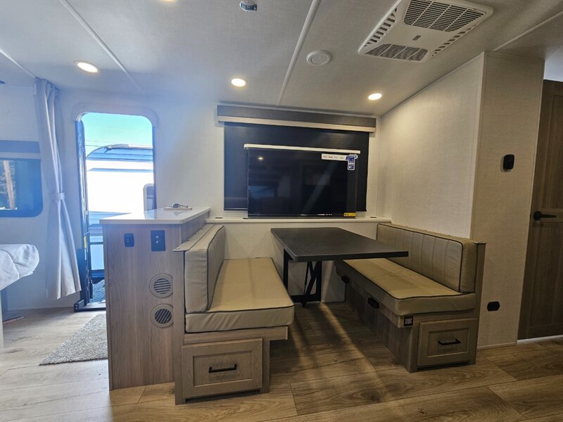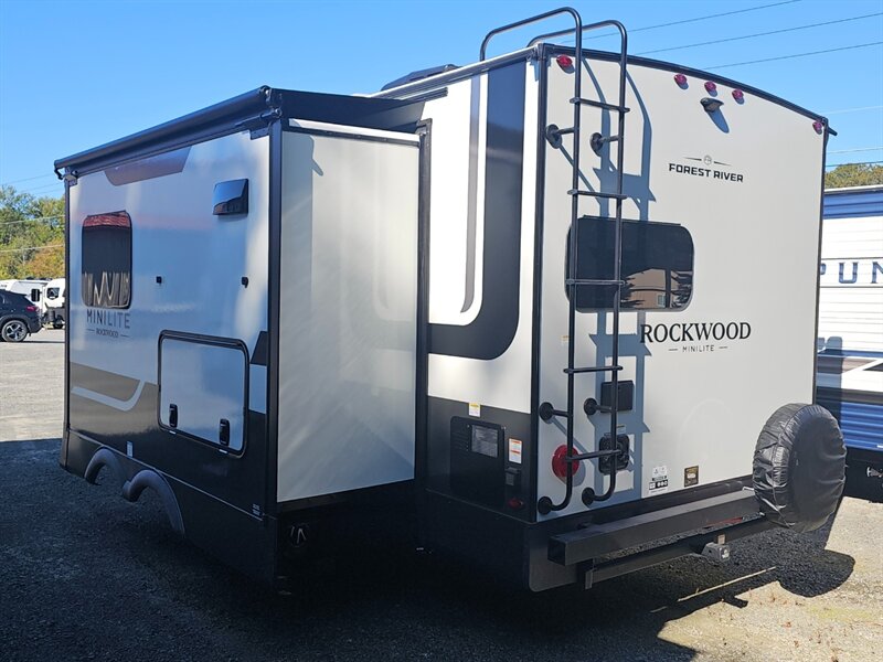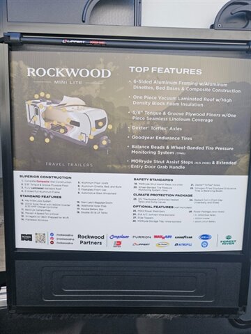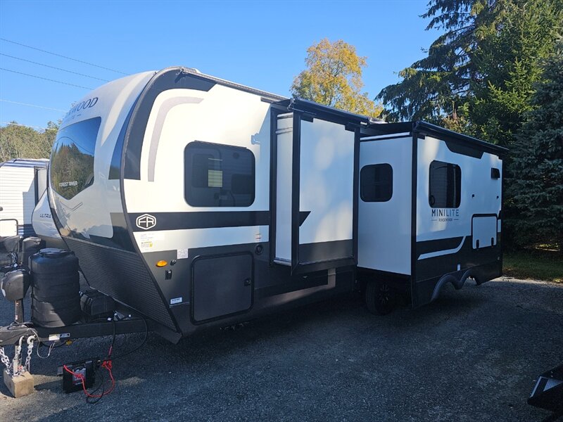 The Forest River Rockwood Mini Lite 2522FB is a lightweight travel trailer featuring a front queen bedroom, a rear kitchen, a full rear bathroom, and a large slide-out with Theater Seating for added living space, opposite a booth dinette with extra large windows. It includes features like a power awning, power tongue jack, power stab jacks, 12V refrigerator, 12V Smart TV on a televator, 200W solar panel charge controller and 1800W Inverter, an automotive windshield, and is built with a 6-sided full aluminum frame and composite walls for durability. The 2522FB is designed for couples and small families seeking a compact yet well-equipped and comfortable travel experience, including year-round camping capabilities with its heated holding tanks and thermal insulation.