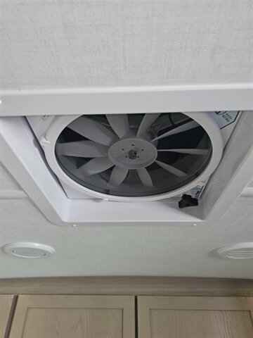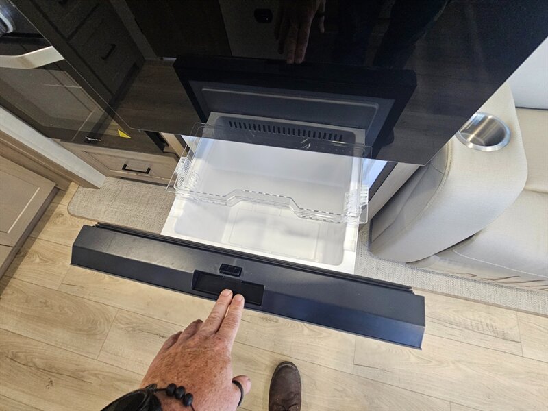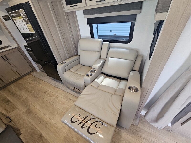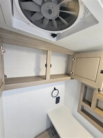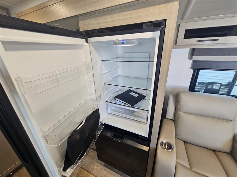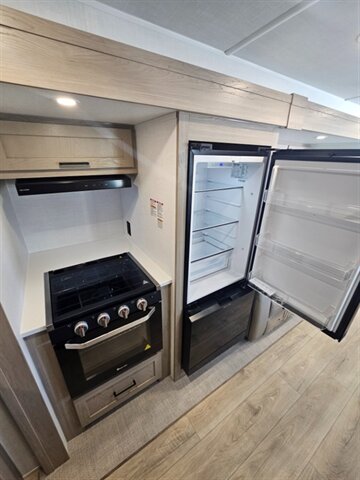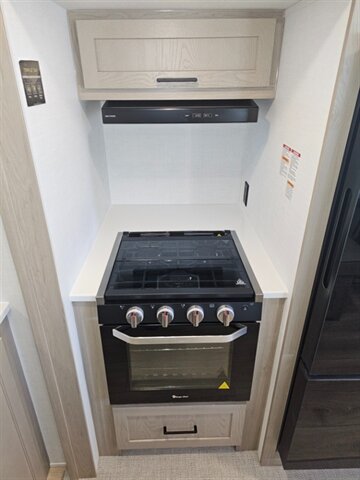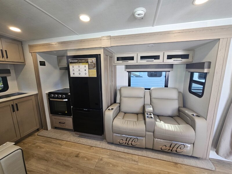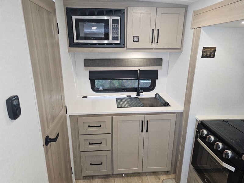 Kitchen: A spacious rear kitchen with a 12V refrigerator, three-burner cooktop, microwave, solid surface countertops, and a large walk-in pantry.