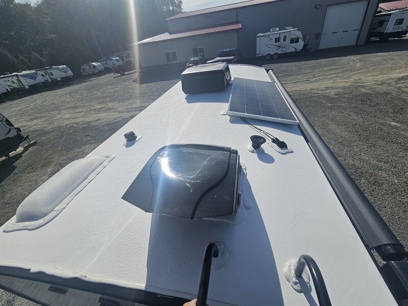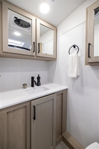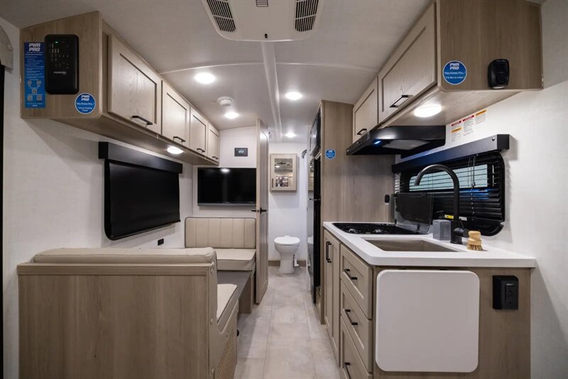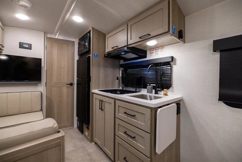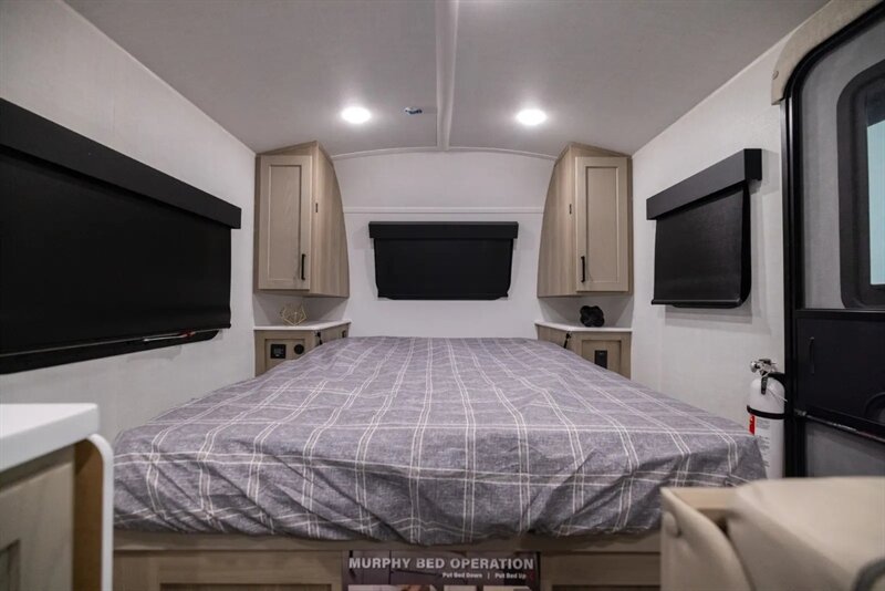 The Rockwood Geo Pro G19FD has a Murphy bed that creates all the space needed for a great couples coach. The windows beside the dinette are very large and easy to see your campsite from. The bathroom in this model goes all the way across the back end of the coach giving you the most space you can get in a unit this size. At 20’ long and just over 3000 lb, this model is perfect for anyone that wants to hunker down at a great park or with solar equipped boondocking for a long period of time.