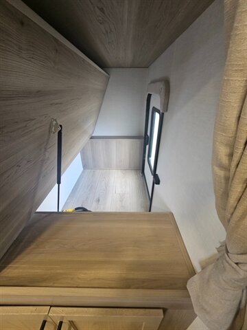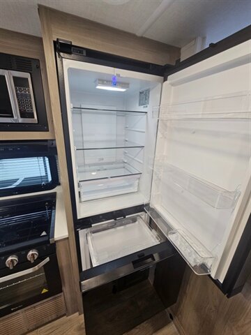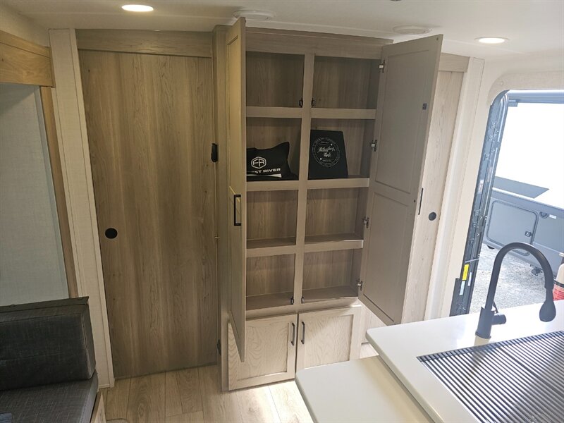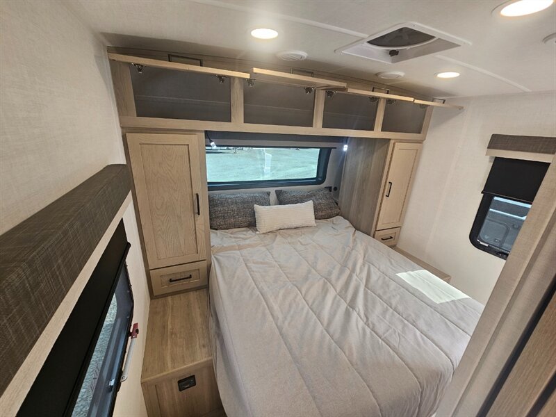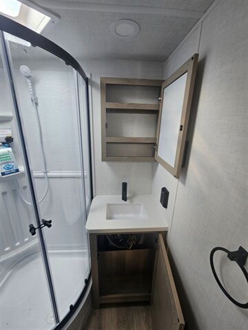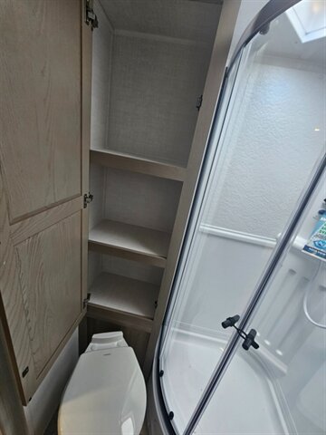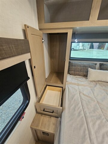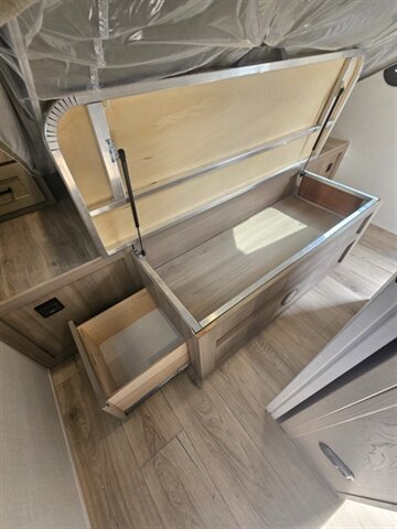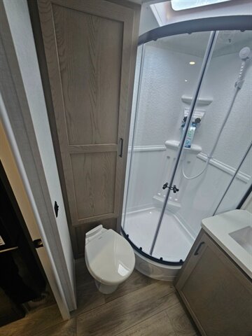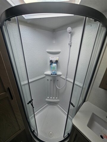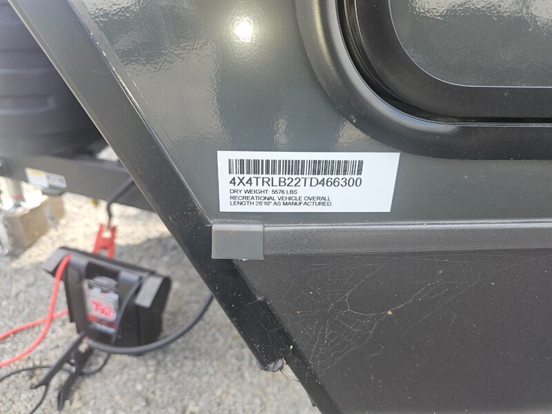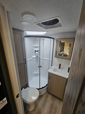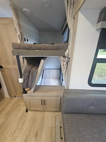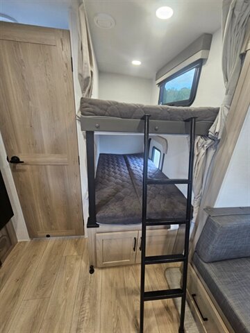 This camper sleeps 6 people comfortably with a dedicated main bedroom - walk around queen bed and two wardrobe cabinets on either side. Flip up storage under the bed. Moving to the living space with a center kitchen with a large L-shaped countertop with countertop extension. DEEP and WIDE sink, microwave, stove top, oven and 12vdc fridge. Dining area is a LARGE U-shaped dinette 44 x 85 that can turn into a sleeping area for two. The two bunk beds also boasts a big 36 x 71 top and bottom bunk, with the bottom bunk flipping up for added storage accessible from the outside through a large bike door. The bathroom is spacious, featuring a porcelain toilet, neo-angled shower with a water saving faucet that tells you when the water is hot for your shower. NO MORE wasted water down the drain while waiting for hot water. The outside comes equipped with a 2" receiver hitch that can handle up to 300lbs of gear. The roof has a 200 watt solar panel that feeds power to the two deep cycle batteries. A 1800 watt inverter will supply AC power when needed.